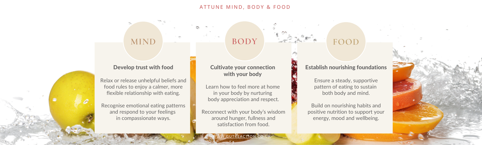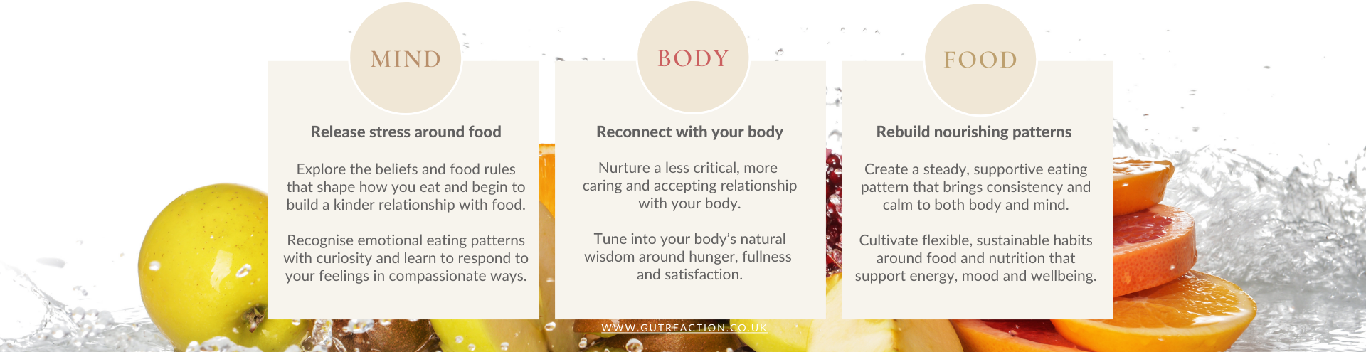 To support the physiological and psycho-emotional aspects of your relationship with food, the approach is informed by a range of evidence-based modalities including Nutritional Therapy, Intuitive Eating Counselling, a mindfulness-based behavioural therapy called Acceptance & Commitment Therapy, and the latest in body image healing.