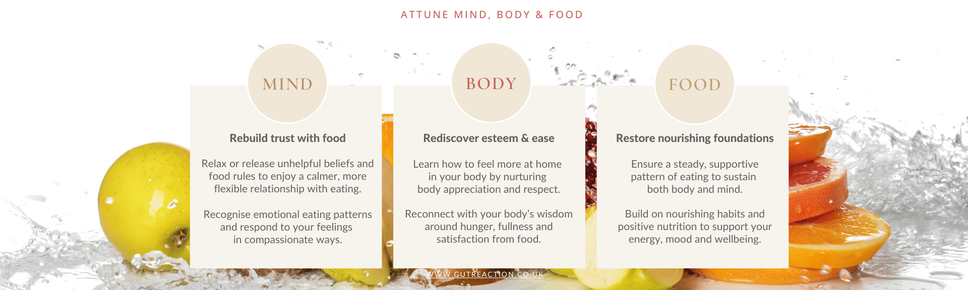 The approach is informed by my training in a range of evidence-based modalities including Nutritional Therapy, Intuitive Eating Counselling, a mindfulness-based behavioural therapy called Acceptance & Commitment Therapy, and the latest in Body Image Healing, to take into account your physiological and psycho-emotional connections with food.